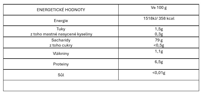 Složení: kukuřičná mouka bílá (60 %), žlutá kukuřičná mouka (29,59 %), hnědá rýžová mouka (1096), voda, emulgátor: mono- a diglyceridy mastných kyselin. Vaření 10 minut. Skladujte na chladném a suchém místě.
