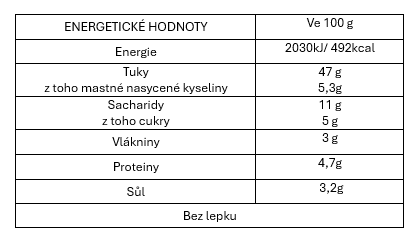SLOŽENÍ: slunečnicový olej, čerstvá bazalka 30%, kešu oříšky, parmigiano Reggjano DOP 5% (mléko), vláknina kukuřice, sušená syrovátka, sůl, mléčné bílkoviny, přírodní příchutě (mléko), extra panenský olivový olej , cukr, regulátor kyselosti: kyselina mléčná, česnek. Může obsahovat stopy skořápkového ovoce