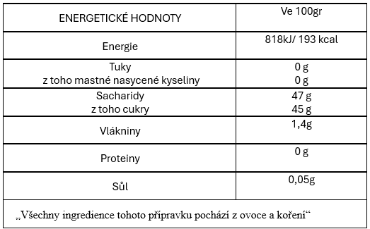 Složení: koncentrovaná jablečná šťáva*, mandarinky* 30% kurkuma* 0,5 %, želírující látka: pertin; koření* "Bio. Bez lepku." Skladujte na chladném a suchém místě. Po otevření uchovávejte v chladničce při teplotě 4°C a spotřebujte během několika dnů.