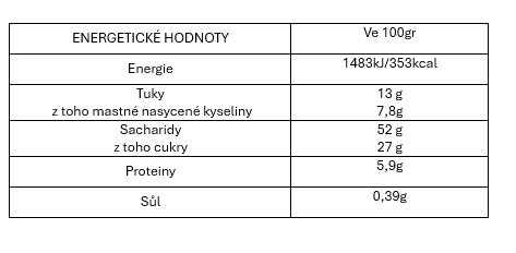 Složení: hladká pšeničná mouka typu "0", Hrozny sultánky, kandovaná pomerančová kůra (pomerančová kůra, glukózovo-frutózový sirup, cukr), máslo, žloutky z čerstvých vajec, cukr, přírodní kvásek 7,5% (mouka pšenice, voda), invertovaný cukrový sirup, emulgátory: mono a digliceridy kyselin tuky (rostlinného původu); čerstvé plnotučné mléko pasterizované 0,8 %, sůl, přírodní aroma. Může obsahovat ořechy, sóju a hořčici..