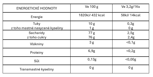 Složení: Cukr, meruňková jádra 18 % (obsahuje siřičitany), vaječný bílek, třtinový cukr 5%, MANDLE" 1%, LAKTÓZA, MLÉČNÉ bílkoviny, kypřící látka (hydrogenuhličitan sodný), přírodní aroma. MŮŽE OBSAHOVAT skořápkové ovoce, LEPEK. "Vyrábí se z čerstvých vajec z volného chovu a s mandlemi ze Sicílie. Skladujte na chladném a suchém místě, mimo zdroje světla.