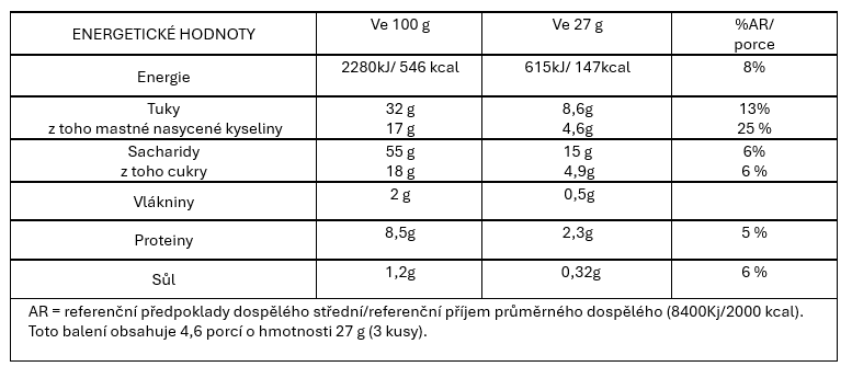 Složení: pšeničná mouka, rostlinný margarín (palmový olej, voda, sůl, emulgátor: EA71), poleva 25% (cukr, vaječný bílek, prášek z vaječných bílků, příchutě) meruňková dekorace 2% (cukr, meruňka 30%, sirup glukóza-fruktóza, koncentrovaná citronová šťáva, škrob, želírující látka: E440), sušené odstředěné mléko, bezvodé máslo, glukózo-fruktózový sirup, sůl, příchutě. Může obsahovat hořčici, sója a skořápkové ovoce. Skladujte v chladu a temnu.