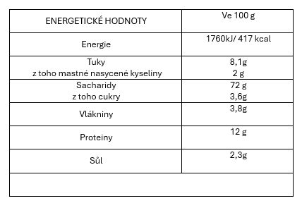 Složení: PŠENIČNÁ mouka hladká typu "0", olivový olej (4,4%), extrakt z JEČNÉHO sladu, sádlo (2,5%), sůl, deaktivované sušené droždí, droždí, přírodní aroma z rozmarýnu. Může obsahovat SÓJU, SEZAMOVÁ SEMÍNKA a HOŘČICI. Skladujte na chladném a suchém místě. Spotřebujte do: viz datum vytištěné na spodní straně obalu.